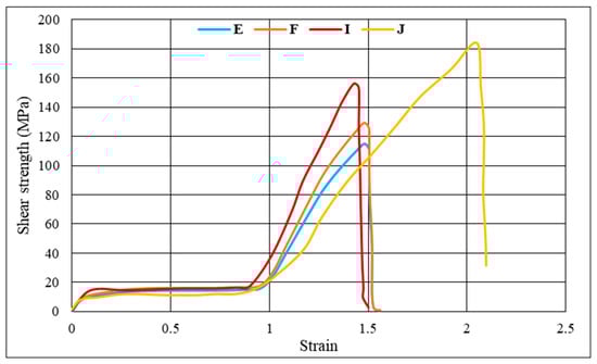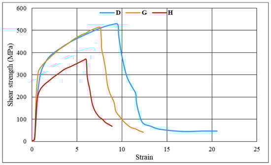 Shear strength samples for AISI 304 stainless steel were welded under ideal RSW conditions as reported in [] for the 1–1 mm (case D), 0.5–0.5 mm (case G), and 0.5–1 mm (case H) cases. The shear strength of AISI 304 stainless steel revealed that the 1–1 mm case (D) had the maximum shear strength at 526.8 MPa as shown in Figure 5, in contrast to 515.2 MPa for the 0.5–0.5 case (G) and 369.5 MPa for the 0.5–1 mm case (H). Similar to the observations for the RSW titanium alloy cases, the unequal-thickness RSW joints for AISI 304 (case H) exhibited the lowest strain before failure compared to the equal-thickness RSW joints for cases D and G. This was due to the reasons previously explained for the titanium RSW joints.