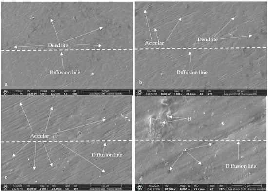 Welding raises the temperature beyond the beta-transus temperature, approximately 882 °C, leading to an increase in the grain size, even though the area outside the molten pool remains unmelted. Concurrently, the microstructure approaches a pure β phase as all the martensitic α in this area vanishes and the α is converted into β. Figure 7a,d demonstrate that dendritic formations primarily compose the WZ of similar titanium RSW joints. The microstructure of the welding zone (WZ) in Figure 7c reveals a predominantly aligned acicular composition. However, upon cooling, the phase transforms into the alpha phase. The high cooling rate of the RSW process can trap some beta-phase grains in a metastable form, as shown in Figure 7d, potentially leading to fine, acicular alpha structures (martensitic alpha). This acicular alpha structure is generally harder and more brittle than the parent alpha phase []. As the temperature rises throughout the RSW process, the α phase in the HAZ progressively converts to the β phase, resulting in an increase in the grain size of the β phase. Concurrently, when the heat input increases, the displacement and absorption of the β phase border become more pronounced. Consequently, increased optimum heat input during the RSW process results in microstructures of the HAZ and WZ becoming more similar, producing an unseen fusion line as shown in Figure 7a–d; this is supported by [].