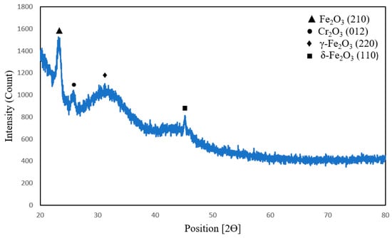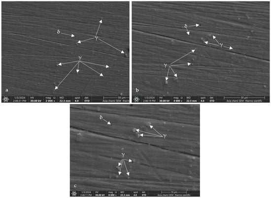 Under equilibrium solidification, the microstructure of 304 stainless steel is mostly made up of austenite (γ-Fe), which is a well-known fact. It is certain that some metastable Fe will be present under non-equilibrium fast solidification circumstances like the RSW process due to the high cooling rate, which might cause incomplete transformation [,]. It is well known that the ratio of ferrite to austenite in 304 stainless steel in the RSW process is affected by the amount of heat used. Therefore, the RSW process produces a slightly different ratio of ferrite to austenite in the fusion zone. The 304/304 nugget showed the ferritic-to-austenitic mechanism of solidification. Due to the non-equilibrium rapid solidification condition in the RSW process, the peak temperature in the fusion zone is much higher than the upper limit of the phase balance between the δ-Fe and γ-Fe phases. The austenite starts to precipitate at the ferrite grain boundaries during the cooling of joints in the temperature range 1573–1073 K []. Since the δ-γ transformation is a diffusion-controlled process, the fast cooling in the RSW process does not offer sufficient time to complete the phase transformation. As a result, a small amount of ferrite stays at the austenite grain boundary even after the nugget cools down to room temperature, as confirmed by the SEM inspection in Figure 9. To clarify the phase structure of the AISI 304 joint, X-ray diffraction was used to analyze the spectrum and phases generated after AISI 304 was welded; the XRD phase analysis spectrum is given in Figure 10. The XRD results proved that the γ-Fe and δ-Fe phases were found in the welded joint.