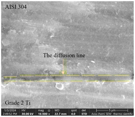 Reducing the grain coarsening of the dissimilar AISI 304/Ti grade 2 joint through heat input control has an inverse effect on the shear strength, which in turn affects the performance of the weld joint. This explains why, in contrast to the results reported in [], the shear strength of the RSW joints in the present study of the dissimilar joint is superior. Implementing all of the RSW parameters at varying levels and without excluding any variable also leads to the previously indicated improvement in shear strength. The results from an SEM analysis confirm the aim of improved welding characteristics (Figure 11). According to the SEM findings, the two metals completely diffused into each other since the diffusion line joining them is unseen.