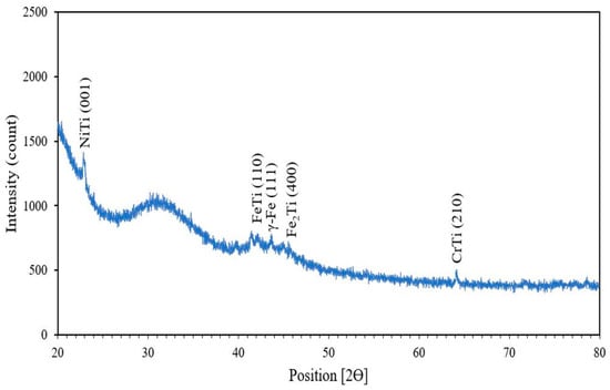 The XRD test conducted on the fusion line of the optimum Ti/AISI 304 joint (case I) reveals the produced phases in the welded joint, as shown in Figure 12. According to the XRD data, dissimilar welded titanium and stainless steel joints with the NiTi phase are desirable because they help to decrease the amount of brittle IMCs like FeTi, Fe2Ti, and CrTi that formed in the joint under study. The combined strength of the welded joint is improved by this. Thus, the presence of IMCs such as FeTi and Fe2Ti stimulates brittleness and functions as a stress concentrator, thereby facilitating the initiation and propagation of cracks under shear stresses. Furthermore, the inclusion of IMCs like CrTi introduces localised hardness and fracture sensitivity, hence lowering the shear strength. These three IMCs reduce the joint’s ductility, decreasing its ability to resist deformation before failure. The existence of the NiTi phase in the dissimilar joint is advantageous because it improves joint quality and decreases the influence of these three IMCs on the shear strength. The XRD examination also revealed the presence of γ-Fe as a phase. It was shown that this phase improves the shear strength and ductility of the welded joint; this claim is supported by [].