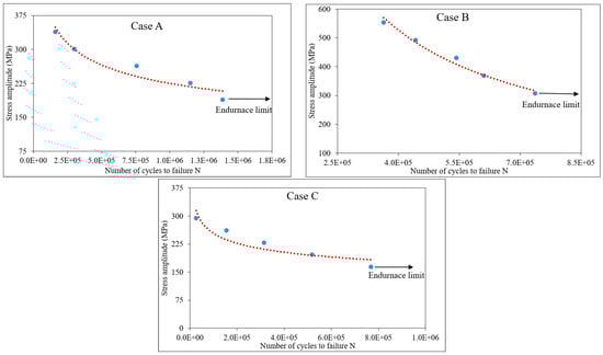 Figure 13 illustrates the relationship between the stress amplitude and endurance limit (fatigue life) of welded titanium joints across different cases. The fatigue results for the 1–1 mm welded joint (case A) exhibited the greatest fatigue life in comparison to case B (0.5–0.5 mm) and case C (0.5–1 mm). The S-N curve indicates that the fatigue life for case A increased as the applied stress level increased from 188 MPa (0.9% of UTS) to 338.4 MPa (0.5% of UTS), as shown in Figure 13. The endurance limit decreased from its greatest value of 1.39 × 106 cycles to its lowest value of 1.61 × 105 cycles for this particular case. The findings of the S-N curve for case A showed that the data points were very close to each other when the applied stress was within 0.8–0.9% of the ultimate tensile strength (UTS) of case A. The data distribution, however, was much wider when the stress amplitude was between 0.5% and 0.7% of the UTS in case A. It is worth mentioning that the lowest number of cycles that case A could tolerate before failure was 1.61 × 105 at an applied stress of 552.6 MPa (0.9% of UTS for case A). The internal defects within the specimen may have an uneven size distribution when subjected to low stress, which might explain this. Figure 13 shows that the fatigue life of case B (0.5–0.5 mm) followed the same pattern as case A. As the applied stress increased from 307 MPa (0.9% of UTS for case B) to 552.6 MPa (0.5% of UTS for case B), the fatigue life decreased from 7.37 × 105 cycles, which was the highest, to 3.64 × 105 cycles, which was the lowest value. It can be noted that case A revealed a higher fatigue life than case B despite the tensile strength of case B being higher than that of case A. Therefore, the fatigue strength of a spot-welded joint is not directly proportional to the material’s strength. Consistent with previous studies, the findings of this paper show that the spot weld fatigue performance is unaffected by the strength of the material under low load and high cycle conditions [,,]. Both the spot weld’s loading characteristics and the stress concentration factor of the weld’s surrounding circumferential notch determine the fatigue strength.