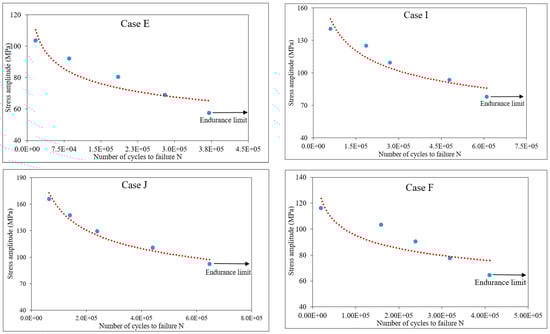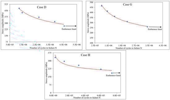 The S-N curves of the welded joint of AISI 304 for different cases are shown in Figure 14. It is noteworthy that as the applied stress decreased, the fatigue life of cases D, G, and H increased. However, as observed in the RSW joints of titanium alloy, the fatigue life of equal sheet thickness is greater than that of unequal sheet thicknesses. With an amplitude stress of 265 MPa, which is 0.5% of UTS for case D, the maximum fatigue life of 4.56 × 106 cycles for case D (1–1 mm) was achieved. However, when 477 MPa (0.9% of UTS) was used as the applied stress, the fatigue life for that welded case decreased to 1.19 × 106 cycles. Case G (0.5–0.5 mm) had a lower fatigue life than case D (1–1 mm), according to the results of the comparison of the two cases’ fatigue lives. The case G fatigue life was found to be 3.35 × 106 cycles at an applied stress of 258 MPa, which is 0.5% of UTS as shown in Figure 14, while the case G fatigue life was 6.45 × 105 cycles at an applied stress of 464.4 MPa, which is 0.9% of UTS. There was a significant reduction in the fatigue life at different stress ratios, as shown by the fatigue findings for case H (1–0.5 mm) in Figure 14. At a loading stress of 184 MPa, which is 0.5% of UTS, the maximum fatigue life for the RSW joint of AISI 304 stainless steel is 7.39 × 105 cycles. However, when the loading stress is increased to 331.2 MPa, which is 0.9% of UTS, the fatigue life is reduced to 2.41 × 104 cycles, which is regarded as the lowest fatigue life. This is due to the reason that was previously stated concerning the variation in the fatigue life between titanium sheets of equal and unequal thicknesses.
