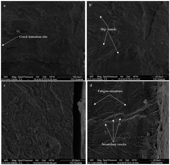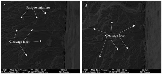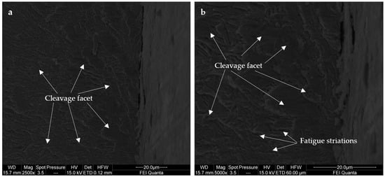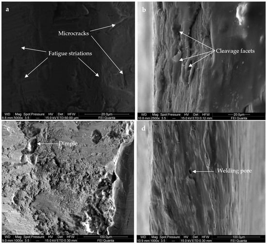 The analysis of static and fatigue behaviour of laser-butt welded joints made of titanium grade 2 and grade 5 was conducted by Casavola et al. []. They claimed that fatigue failures in the titanium grade 2 and grade 5 samples occur inside the base materials but not at the weld location. In terms of static characteristics, titanium grade 5 was found to be superior to titanium grade 2. There was a significant difference between grades 2 and 5, with 780,182 cycles being the maximum fatigue cycle number to failure for grade 2, and this value was 980,511 cycles for grade 5. The research conducted by Liu et al. [] further advanced the understanding of titanium alloy welds, specifically through electron beam welding. Their findings indicated that the fatigue strength of joints could exceed the yield strength of the base metal, particularly when post-weld treatments were applied. The identification of fatigue crack initiation points and propagation characteristics within the weld zones provides essential insights into the behaviour of welded titanium joints under varying stress conditions, highlighting the intricate relationship between microstructural features and fatigue performance. Corigliano et al. [] evaluated the fatigue life of Ti-6Al-4V laser welded joints. The study’s findings aimed to identify the damage mode of the components through thermographic tests. Thermographic analyses showed that specimens failed in various ways; for example, fatigue fractures started at the horizontal plate’s radius of curvature and advanced longitudinally until they broke completely. Additionally, cracks spread laterally along the radius of curvature of the vertical plate, which causes the welded region to experience the highest strain and temperature rise.