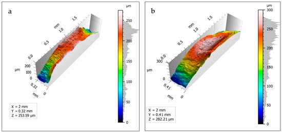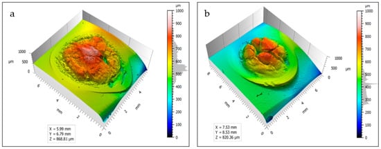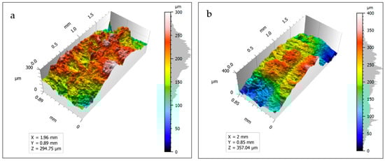 The 3D surface topography of the fatigue-fractured surface was determined using a profilometer (Infinite Focus Alicona Imaging GmbH, Graz, Austria) according to the focus variation method. The obtained profiles were then analysed using MountainsMap (version 7.1) surface data analysis software from Digital Surf (Besançon, France) []. This method of noncontact measurement involves projecting beams of white light onto the sample’s surface. A precise sensor processes the reflected light rays that emerge from the surface being measured. The topography-selected parameters (Sa, Sq, Sz, Ssk, Sku, Sdq and Vv), together with their descriptions and equations, are presented in Table 5 in accordance with ISO 25178-2 [].