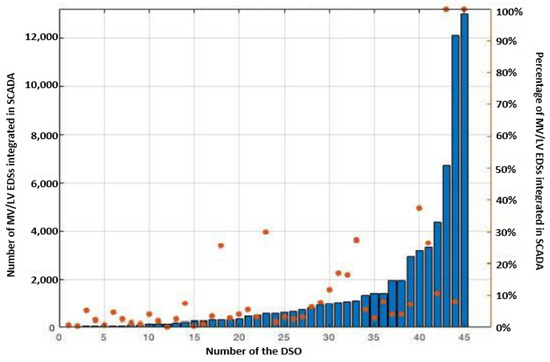 The brown circles in the figure signify the percentage of MV/LV EDSs integrated into the SCADA system. The data analysis highlights an integration degree of 30% at most DNOs (93%). Only 3 of 45 DNOs (7%) have exceeded this value.