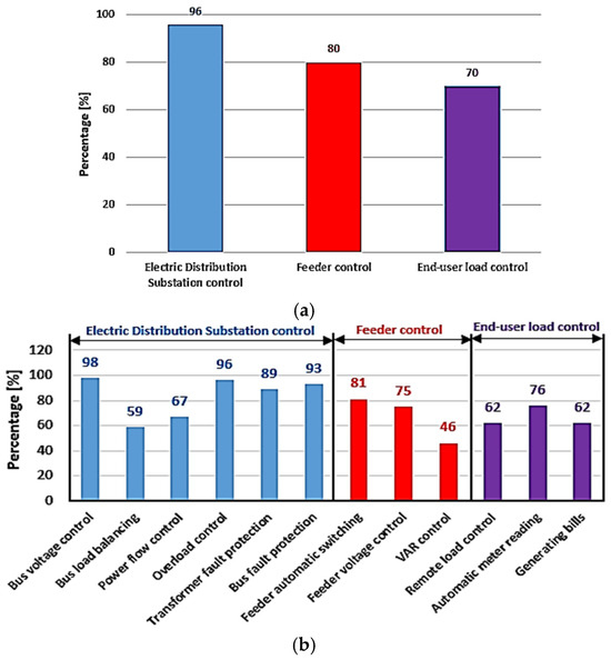 The DNOs can use the SCADA system to monitor and control various system elements, such as power transformers, electric lines, etc. With the help of data acquisition capabilities, it can also provide significant insight into the operation of the power system. SCADA systems are commonly used on the distribution side to automate the various components of the networks. They contain the following in their structure: a remote terminal unit (RTU), a master control centre, and a telecommunication network. All European DNOs use the SCADA system, which includes one or more functions: substation control, feeder control, or end-user load control (see Figure 2). The data from the figure were from a survey carried out at the level of 56 DSOs from European Union countries and synthesised in the “Distribution System Observatory 2022” report [4] published in 2023.