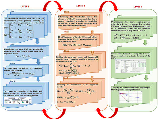 - The second layer identifies the “candidate” classes and the pilot EDSs (representing the optimal solution) with the SCADA measurements placed. The optimal placement corresponds to the minimisation of the estimation errors obtained using the multiple linear regression models between the EDSs from the classes not included in the set of the “candidate” classes and the pilot EDSs.
