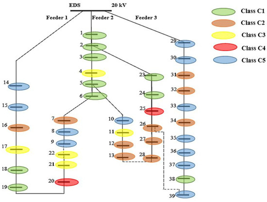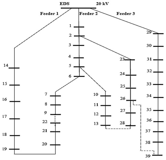 A real urban MV EDN has been used to test the proposed framework. The END, supplied from an HV/MV (110/20 kV) EDS, contains 3 MV feeders with 39 MV/LV (20/0.4 kV) EDSs. Figure 4 presents the topology of the test MV EDN.