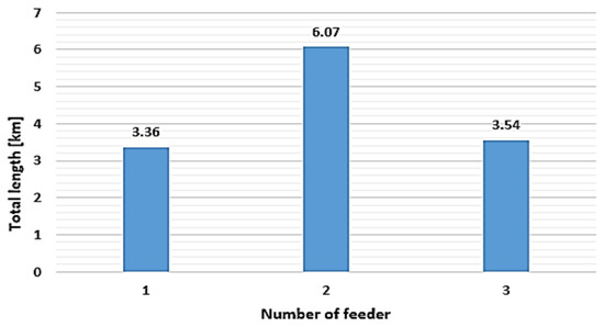 Table A1 from Appendix A includes each branch’s length between two EDSs associated with each feeder. The EDN has the cross-section of the first branch (EDS-1, EDS-14, and EDS-29), with a size of 185 [mm2] (r0 = 0.157 [Ω/km] and x0 = 0.112 [Ω/km]), which is different from the other branches, equal to 150 [mm2] ((r0 = 0.194 [Ω/km] and x0 = 0.115 [Ω/km]). Also, the branch length is in the range of [0.1–0.5] km, with a total length for the second feeder of 6.07 km higher than the other two feeders (3.36 km for the first feeder and 3.54 km for the third feeder, respectively). Figure 5 presents the synthesis of this information.