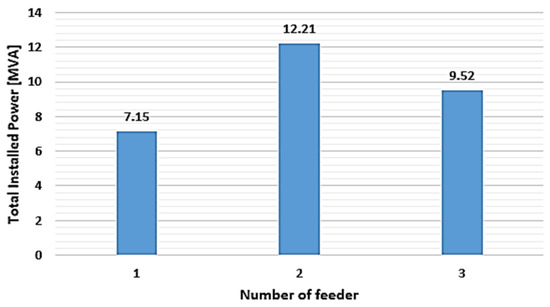 The rated power of the transformers, denoted with Sr, from the EDSs supplied by the three feeders, is between 400 and 1000 kVA (see Table A2 from Appendix A). The total installed powers (calculated as the sum of the rated powers of the distribution transformers supplied by each feeder) are 7.15 MVA for the first feeder, 12.21 MVA for the second feeder, and 9.52 MVA for the third feeder, resulting in the total power of the EDN at 28.88 MVA (see Figure 6).