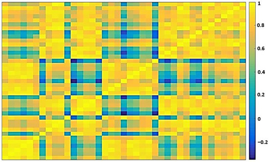 Step 2 of the first layer involves the calculation of the correlation coefficient between each of the two EDSs from the analysed EDN, which is recorded in the matrix [CC] and has a size of [39 × 39]. Figure 9 presents the heatmap chart associated with matrix [CC] containing the values between −0.1 and 0.99. The vast majority of values are above 0.6. Still, there are also values close to 0 or even negative, which means that as one variable increases, the other decreases proportionally. Application of the K-means algorithm-based clustering process included in the last step of the first layer led to the classes corresponding to the EDSs with similar features of the correlation coefficients.