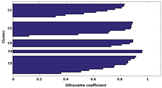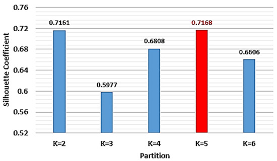 The maximum number of the clusters (named classes in the following) corresponded to a partition in six clusters. The internal test used the silhouette coefficient, and the algorithm identified the optimal number equal to 5 (for which the silhouette coefficient has the highest value, SC = 0.7168); see Figure 10. The representation of the silhouette coefficient for the optimal partition, Kopt = 5, is given in Figure 11.