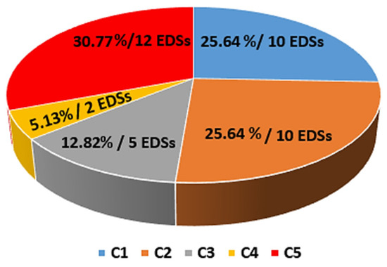 Table A3 and Table A4, from Appendix A, show the quartiles associated with the boxplot representation and two other statistical indicators (mean and standard deviation). The analysis of the information highlights that there are 14 EDSs with a high variation in the powers (9, 10, 12, 14, 17, 22, 27, 29, 30, 31, 33, 34, 38, and 39), 7 EDSs with slight variations (1, 2, 3, 4, 23, 24, and 25), and 18 EDSs with normal variations.