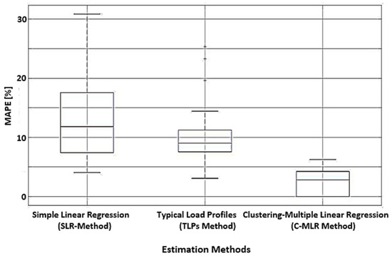 Rong proposed in [28] a different method with three steps for loop distribution networks. He considered aspects regarding network reduction, state estimation, and load forecasting. The analysis results revealed that the average error has been around 3%. A hybrid approach proposed in [29] led to a lower value than 5% for MAPE. Ding et al. built neural network-based models used in the load forecasting process of the MV/LV substations but with a relatively large MAPE (10% approximately) [30]. The benchmark process utilised the multiple linear regression model. All approaches used the SCADA database to estimate the load in the EDSs from the EDNs.