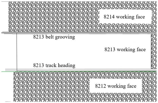 Before mining, the left and right stopes of the Yanjiahe Coal Mine 8213 Gudao working face had been mined long before, which belongs to full mining, and the basic roof of the left and right stopes was seriously damaged and broke into the gangue. Therefore, the vertical section of the 8213 Gudao working face presented a short-arm symmetrical “T” shape structure, as shown in Figure 3.