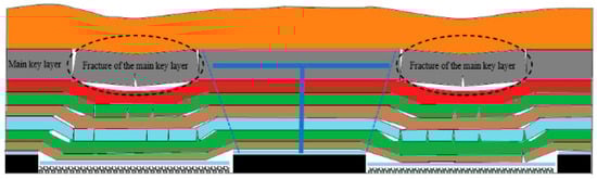 From Equations (6) and (7), it is calculated that the bending moment and stress at the center point (6a, 0) of the fixed support edge of the basic roof reach their maximum values. Therefore, the basic roof first begins to fail and develop cracks in the middle of the fixed support edge. These cracks continue to propagate along the fixed support edge, eventually causing both fixed support edges to completely fracture and transform into simply supported edges. At this point, the outer edges of the basic roof exhibit a vertical “O”-shaped fracture pattern.