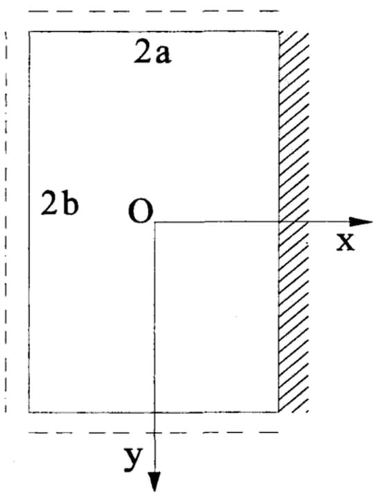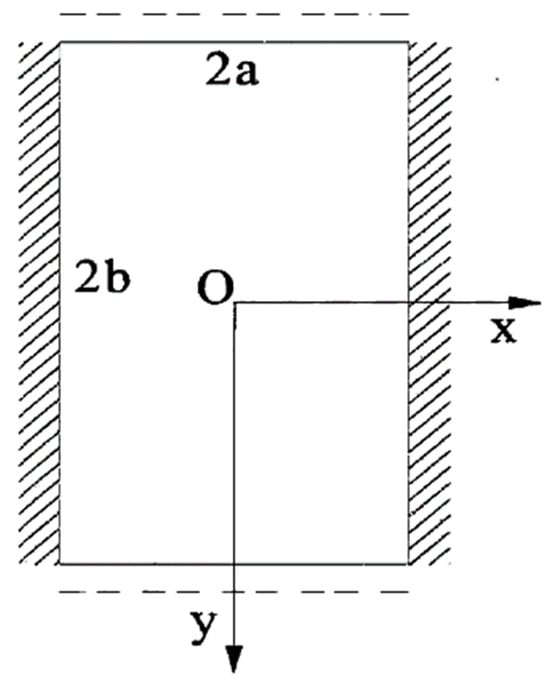 It can be seen from Figure 5 that the basic roof of the island working face can be regarded as a thin plate with three sides simply supported and one side firmly supported during the period of periodic pressure. Because the initial fracture step and periodic fracture step of the roof are often smaller than the stope length, the stope tendency direction, that is, the y-axis direction, is the long side of the plate, and the stope strike direction, that is, the x-axis direction, is the short side of the plate. The length of the long side is 2b. The short side length is the advance length, which is set to 2a using the Rayleigh–Ritz method.