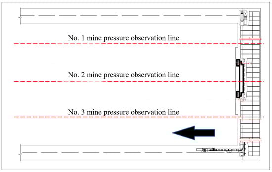 In order to conduct a comprehensive monitoring and analysis of the mine pressure law at the 8213 working face, and to understand the mine pressure manifestation during the mining process of the isolated working face at Yanjiahe Coal Mine, a mine pressure monitoring system was installed at the 8213 working face. The DN10 wireless mine pressure monitoring system was set up with three monitoring stations: Station 1 includes supports #10–33, Station 2 includes supports #34–57, and Station 3 includes supports #58–81, as shown in Figure 6. This monitoring lasted for 30 days. The support system at the working face uses a shielded hydraulic support, and the pressure sensors for the working resistance of the supports are installed at the three monitoring stations. Monitoring was conducted at the upper, middle, and lower parts of the working face.