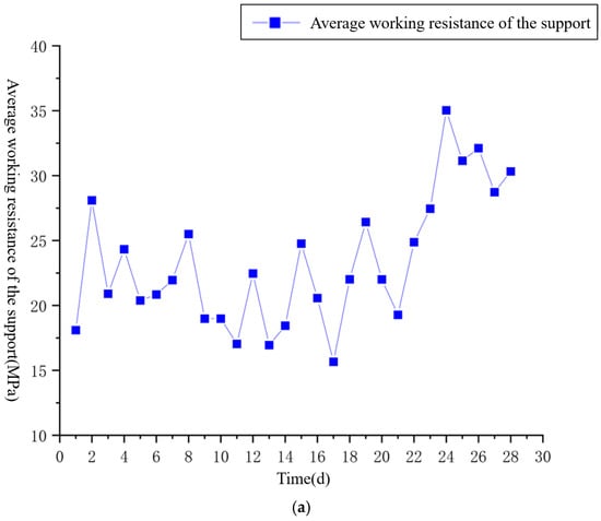 Monitoring equipment for the working resistance of the supports was installed on the support columns within the monitoring stations. The variation of the average working resistance of each support with the advancing time of the working face is shown in Figure 7.