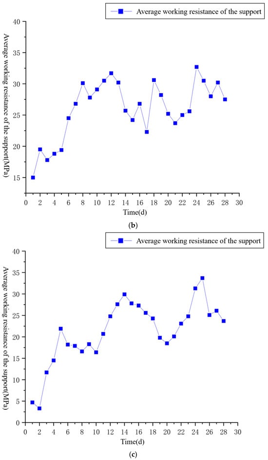 The curve graph of the average support resistance variation of the 8213 working face during the mining recovery stage. (a) upper monitoring Station 1, (b) middle monitoring Station 2, (c) lower monitoring Station 3.