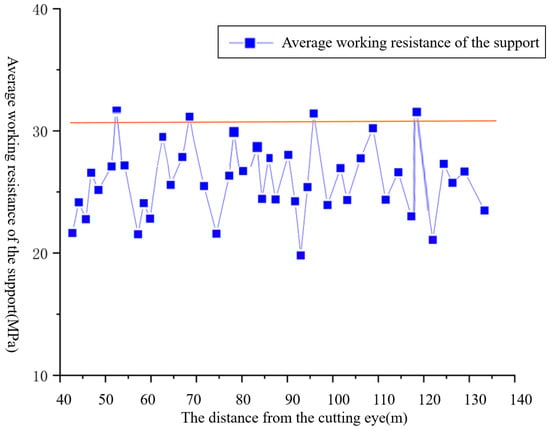 Considering the unevenness of the supports caused by the support technology during the monitoring period, the basic roof pressure cannot be accurately reflected on each individual support. To make the judgment of basic roof pressure more accurate, the overall average working resistance of the supports with respect to the advancing distance of the working face was taken as the research object (as shown in Figure 8). As the working face gradually advances, the overall resistance of the supports shows a trend consistent with the resistance variation of individual supports, but the resistance values change. The supports exhibit a relatively regular periodic variation, and during non-periodic pressure periods, the resistance generally fluctuates stably below the rated working resistance. When the basic roof caves, the average working resistance of the supports increases significantly. The overall average resistance of the supports reaches approximately 25.85 MPa with a maximum of about 31.93 MPa and a minimum of about 19.80 MPa. From the advancement of the working face from 40 m to 140 m, approximately three pressure events occurred during this phase, with the periodic pressure step distance ranging from 16 m to 27 m, and the average pressure step distance being 22 m.