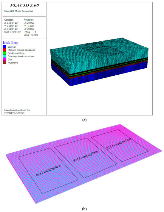 Original computational model. (a) Three-dimensional model stereogram, (b) coal seam cross-section diagram of 3D model.