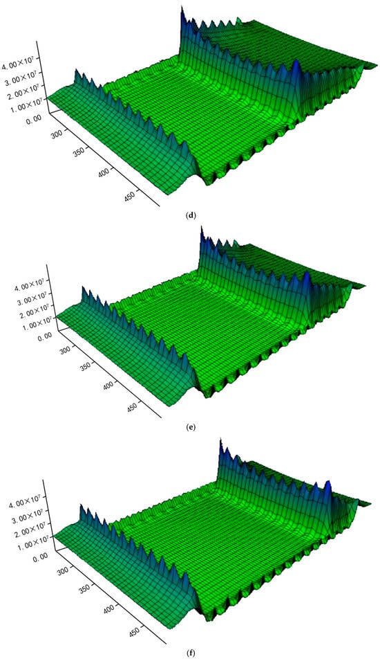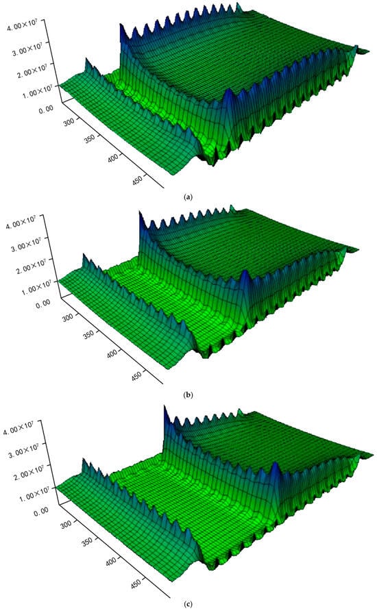 Figure 11 illustrates the vertical stress distribution of the isolated working face at different advancement distances, revealing that the overall surrounding rock structure exhibits a “C”-shaped stope characteristic under the conditions of goaf on both sides of the working face. This structure forms due to the stress distribution caused by the interaction of gravity and geomechanics during the mining process of the isolated working face and its upper and lower sections. When the isolated working face begins to retreat, the vertical stress within the coal body increases rapidly, particularly at both ends of the working face and the front area of the retreating face. These locations become stress concentration points, displaying a saddle-shaped stress distribution.