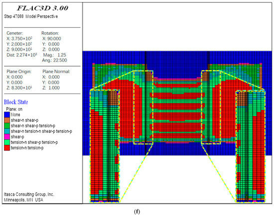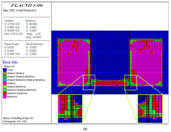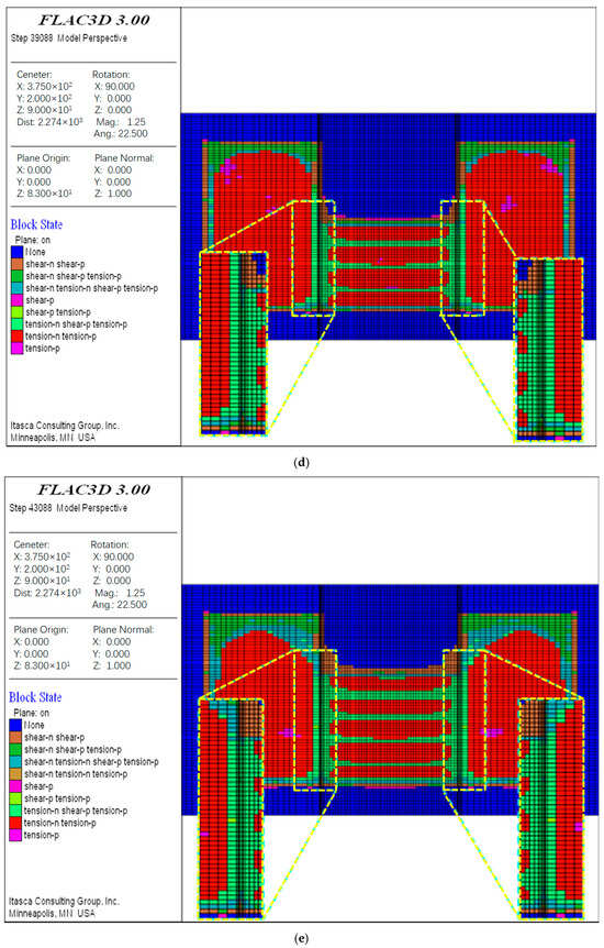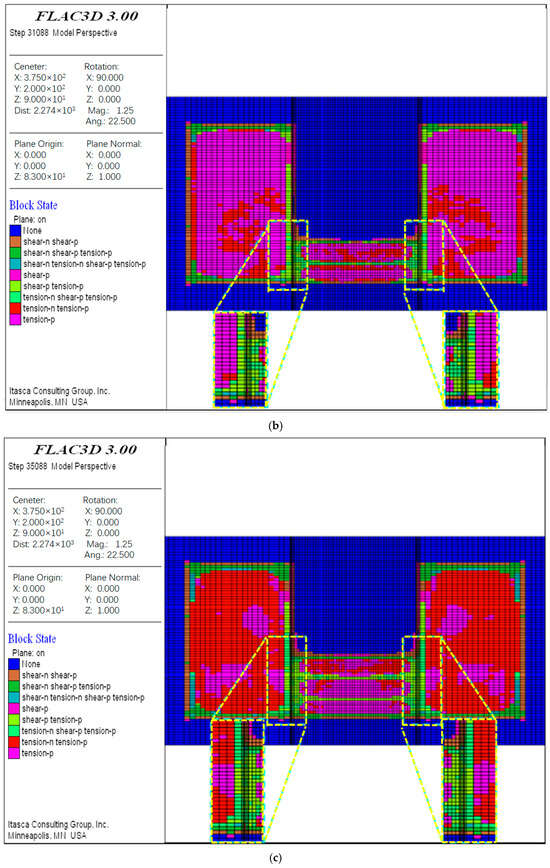 The evolution process of the plastic zone is directly related to the long-term stability and safety of the roadway. With the advance of the working surface, the stress of the surrounding rock is constantly adjusted, and the plastic zone gradually expands and redistributes. In-depth analysis of the evolution law of the plastic zone of the surrounding rock of the roadway not only helps to reveal the instability mechanism of the surrounding rock but also provides an important basis for reasonable support design and mine pressure control. The variation range of the plastic zone under different advancing distances is shown in Table 4.