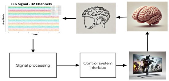 The use of brain EEG signals with serious games is a recent trend in research [15,16,17,18]. The existence of new types of EEG sensors available for game development makes it possible to adapt games that use recognition of brain states [19]. The process for mapping brain activity into game actions is demonstrated in Figure 1, which provides an example of a BCI system used in gaming. Neural signals originate in the human brain and are recorded by an EEG cap. The raw brainwave data, represented as multi-channel EEG signals over time, is visualized to highlight the neural activity being recorded. After passing through a specialized signal processing module, these signals are sorted, filtered, and converted into commands or patterns that can be used. These patterns are converted into precise game commands, like movement or activities within the game environment, by feeding the processed outputs into a control system interface. Lastly, an interactive combat game serves as an example of how these directives are carried out in a gaming environment.