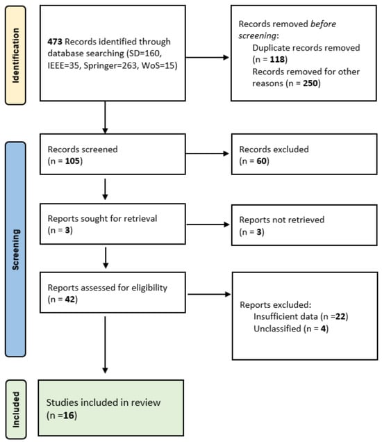 The search was performed in the following databases or bibliographic tools: Web of Science (WoS) (https://clarivate.com/academia-government/scientific-and-academic-research/research-discovery-and-referencing/web-of-science/web-of-science-core-collection/), IEEE Xplore (https://ieeexplore.ieee.org/Xplore/home.jsp), Science Direct (https://www.sciencedirect.com/) and Springer (https://link.springer.com/), using the following keywords and operators: “BCI” AND “EEG” AND “serious game”. All the resources were collected over the course of one week to ensure the consistency and dependability of our inquiries. First, on 2 September 2024, we assembled the list of references in a single day. We then obtained specific documents from online libraries over the next several days to 7 September 2024. This staged strategy was put in place to avoid an overwhelming number of queries that would compromise our authorized access to those digital databases. A total of 473 references were identified through the database search. The process of removing duplicated registers excluded 118 references. Another 250 references were removed before screening, either for lacking full-text availability or for not being related to the search topics after the initial abstract inspection.