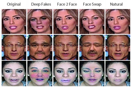 - Rössler, A.; Cozzolino, D.; Verdoliva, L.; Riess, C.; Thies, J.; Nießner, M. FaceForensics++: Learning to Detect Manipulated Facial Images. In Proceedings of the International Conference on Computer Vision (ICCV), Seoul, Republic of Korea, 27 October–2 November 2019. [Google Scholar]