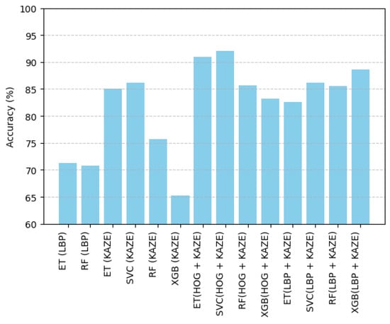 Analyzing the results shows that both LBP and KAZE features individually perform well across different classifiers when tested on the FaceForensics++ dataset. LBP features demonstrated their effectiveness in texture-based analysis, achieving an accuracy of 71.22% with Extra Trees and 70.76% with Random Forest classifiers. Similarly, KAZE features, which focus on detecting structural alterations and keypoint variations in images, produced accuracies ranging from 75.70% with Random Forest to 86.12% with a Support Vector Classifier.