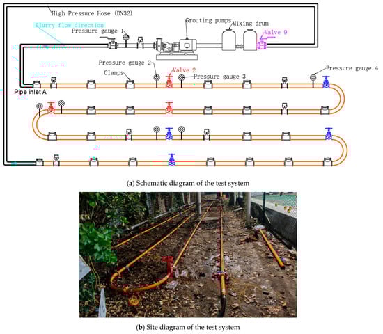 The experimental system spans 130.71 m, comprising 89.71 m of grouting pipeline and 40 m of high-pressure rubber hose. The grouting pipeline consists of 28 straight pipes (3 m in length), 3 elbow pipes (1 m in length), and 2 connecting pipes (0.5 m in length). These components are arranged into 4 rows, each containing 7 straight pipes, as shown in Figure 1.