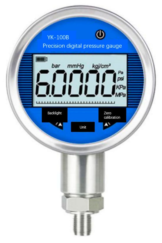 Pressure gauges monitor the pipeline pressure. Pressure gauge 1 measures the initial pressure, while pressure gauges 2 and 3 monitor variations downstream of the blockage. The YK-100B digital pressure gauge was chosen for this purpose (see Figure 2).