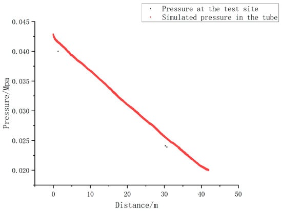 Based on the experimental site, FLUENT numerical simulations were conducted, modeling the first row of pipes on-site, which is 43 m long. The average pressure value from pressure gauge 4 was used as the boundary condition for the pressure outlet. The pressures measured by pressure gauges 1, 2, and 3 were compared with corresponding points in the simulation. The results of this comparison are illustrated in Figure 3.