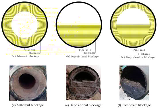 In actual grouting pipeline blockages, most blockages are partial rather than complete. The shape and distribution of the blocking material are irregular and unpredictable. In this study, the simulations focus on three specific types of blockages: attachment-type, deposition-type, and composite blockages. To preserve the integrity of characteristic parameters and minimize the complexity of subsequent model calculations, the irregular shape of the blocking material within the pipeline is simplified and approximated to a regular shape, as shown in Figure 5.