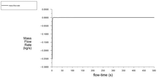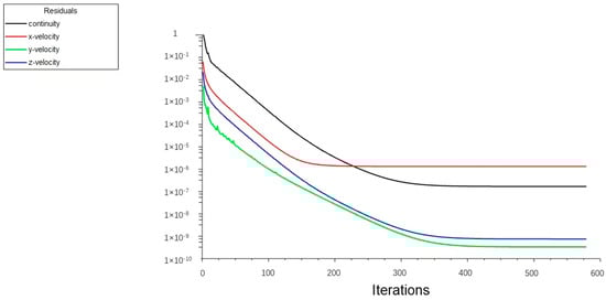 FLUENT 2020R2 is a commonly used CFD [,,] software for simulating fluid flows, heat transfer, and chemical reactions. It can provide results that closely approximate experimental findings and reflect the overall characteristics of fluid motion, such as flow velocity, pressure, and other dynamic parameters. This study investigates the flow behavior of slurry in injection pipelines, where the pipeline temperature is approximately 20 °C. Since the filling slurry is a multiphase complex fluid containing gas, liquid, and solid phases, and it behaves as a non-Newtonian Bingham plastic [,], the slurry maintains its homogeneity and uniformity during pipeline transport without segregation or layering. As a simplification, the slurry flow is assumed to be single-phase. The semi-implicit method for pressure-coupling equations is selected. The inlet is set as a velocity inlet with an inflow velocity of 2 m/s, and the outlet is set as a pressure outlet with a static pressure of 10,100 Pa (relative pressure under atmospheric conditions). To verify the accuracy of the simulation model and computational precision, a residual monitoring window is set, and the residual curve is shown in Figure 8. After fluid initialization, the iteration step is set to 600 steps for computation. During the iterations, the residual curves for each condition converge, and the flux conservation at the inlet and outlet approaches zero, as shown in Figure 9. This indicates that the simulation model closely represents the actual slurry blockage scenarios. The slurry is modeled as a non-Newtonian Bingham fluid, specifically using the H-B model. The slurry density is set to 1700 kg/m3, and the H-B model parameters are configured as follows: the exponent is set to 1, the critical shear stress is 100 r/s, the apparent viscosity is 165.6 Pa·s, and the slurry yield stress is 8.277 Pa.