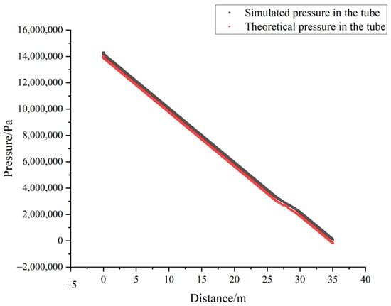 Under the condition of no blockage, the pressure distribution of the pipeline during normal operation is shown in Figure 10, which includes both the simulation results and theoretical calculations. As shown in Figure 10, the pressure distribution obtained from the software simulation aligns closely with the theoretical calculation results, and the pressure decreases linearly with increasing pipeline length. Overall, the calculated pressure values and the simulation results are in good agreement, with a deviation of 9.12%. This error primarily arises from the selection of the coefficient k at the pipe bend. Due to the complex flow conditions at the bend, it is difficult to accurately determine the k value. Nevertheless, it can be concluded that this model design closely reflects the actual operating conditions of the pipeline.