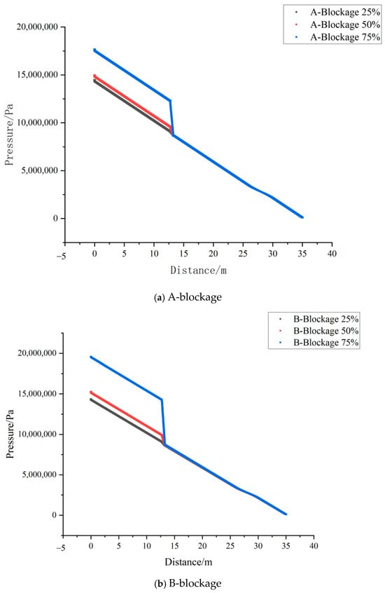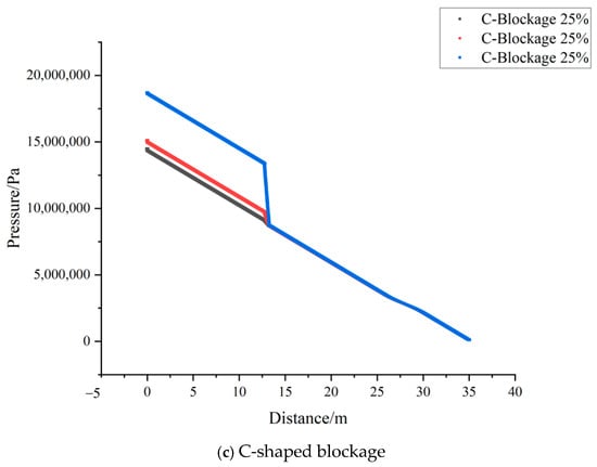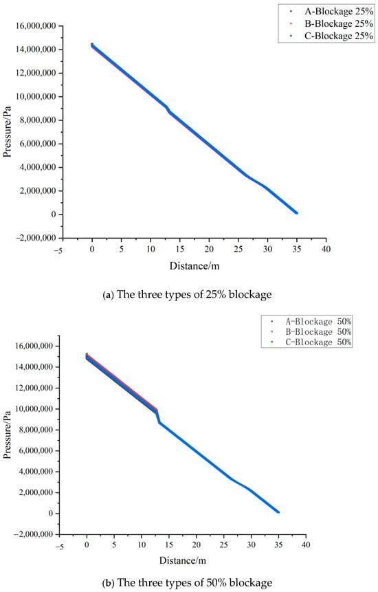 To investigate the relationship between blockage degree and pipeline pressure drop, experimental data under three different blockage shapes were selected. Each set of data corresponds to three levels of blockage: 25%, 50%, and 75%. The pressure along the pipeline for each condition was recorded and compared, as shown in Figure 11.