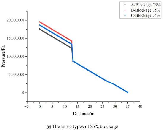 As observed in Figure 11, under the three types of blockage, blockage will cause the overall pressure in the pipe to increase. It is obvious that after the blockage of type B, the pressure is too high, but overall, the pressure-drop values under different blockage degrees increase with the increase in the blockage degree. On the other hand, when the blockage degree is relatively low (i.e., less than 50%), the variation in pressure along the pipeline is minimal, with the maximum pressure drop being only about 3% of the maximum pressure. However, when the blockage degree exceeds 75%, the pressure drop along the pipeline increases sharply, with the minimum pressure drop being over 17% of the maximum pressure. This indicates that the degree of blockage is a significant factor influencing the water flow pressure in the pipeline.