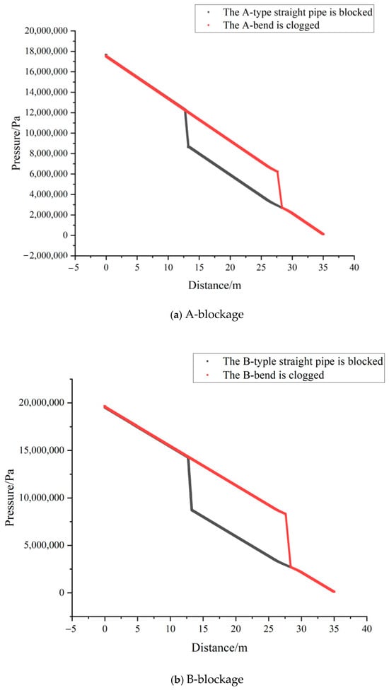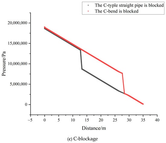 Based on the analysis of Figure 13, it can be concluded that the variation in blockage location has minimal impact on the pressure distribution. The pressure drop along the straight section of the pipeline decreases approximately linearly, while in the bent section, the pressure follows an arcuate reduction in accordance with the theoretical model. When the blockage occurs at the bend, the pressure first decreases linearly along the arc at the blockage point and then continues to drop along the original curvature of the bend.