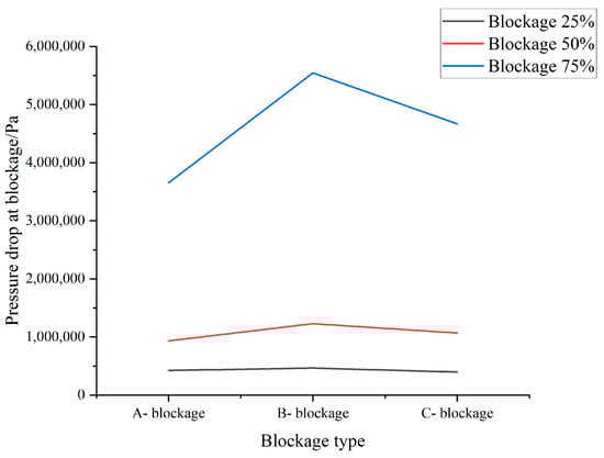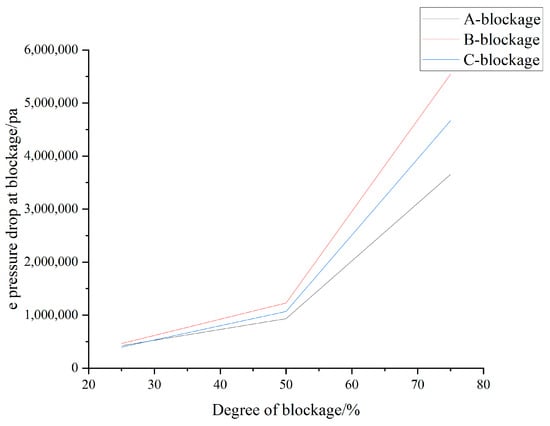 According to Table 2, Figure 14 and Figure 15, the data reveal a clear trend: as the degree of blockage increases, the pressure drop (Pa) induced by all three types of blockages (A-blockage, B-blockage, and C-blockage) rises significantly. Notably, B-blockage results in the highest pressure drop across all levels of blockage, while A-blockage causes the lowest pressure drop. At a 25% blockage degree, B-blockage leads to the greatest pressure drop of 464,150 Pa, whereas A-blockage results in the lowest pressure drop of 424,500 Pa, and C-blockage induces a pressure drop of 397,240 Pa. As the blockage degree increases to 50%, the pressure drop for B-blockage rises further to 1,229,830 Pa, significantly exceeding that of A-blockage (932,270 Pa) and C-blockage (1,069,050 Pa). At a 75% blockage degree, B-blockage causes the highest pressure drop, reaching 5,542,770 Pa, compared to 3,652,260 Pa for A-blockage and 4,669,570 Pa for C-blockage. B-blockage generates the greatest flow resistance within the pipeline, leading to the most substantial pressure drop. Therefore, timely removal of B-blockage is essential for maintaining the normal operation of the pipeline. Furthermore, as the degree of blockage increases, the pressure-drop variation becomes more pronounced, indicating a nonlinear impact of the blockage on flow behavior.