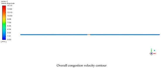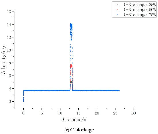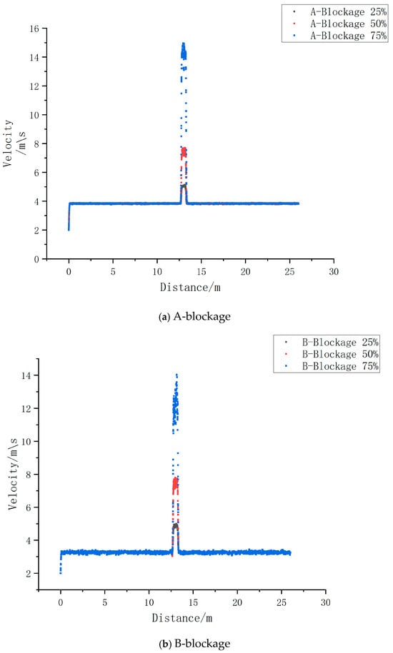 From Figure 19, it can be observed that the flow velocity in the pipeline dramatically increases at the blockage location, reaching its maximum value within a short time. As the blockage degree increases, the velocity in the blocked region rises sharply, with the maximum flow velocity located at the center of the blockage. When the blockage degree exceeds 25%, the flow velocity in the blocked section is several times greater than that in the unblocked portion of the pipeline.