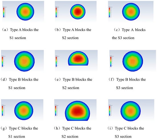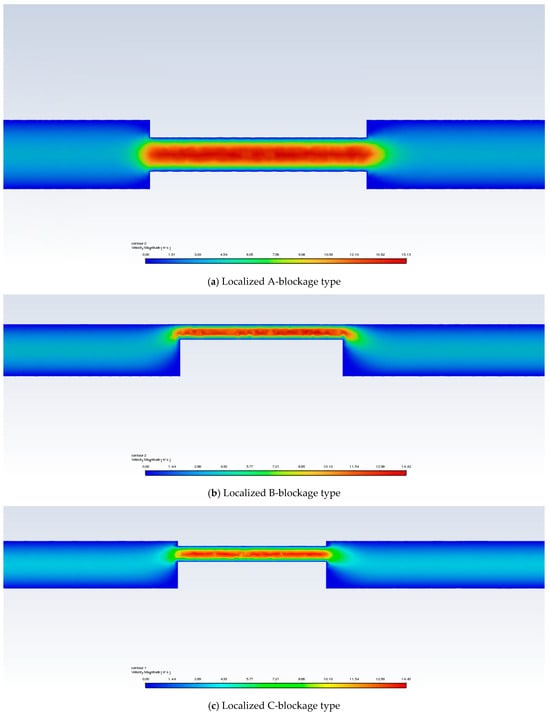 From Figure 16, it can be observed that all three blockage shapes lead to a significant increase in flow velocity. Excessively high flow velocities can cause pipe erosion and corrosion, threatening the safe operation of the pipeline. Below the blockage and in the short section downstream, the flow velocity quickly decreases to near zero, forming a stagnation zone. This condition exacerbates the deposition of solids, thereby worsening the blockage. Notably, in the case of blockage B and C, the stagnation zone area is much larger than that of blockage shape A, indicating that different blockage shapes cause varying levels of disturbance in the subsequent section of the pipeline. Therefore, timely removal of blockages is crucial for the maintenance and management of the grout injection pipeline. To avoid the formation of B- and C-blockages, it is advisable to select pipes with smooth inner walls and low roughness during pipeline construction.