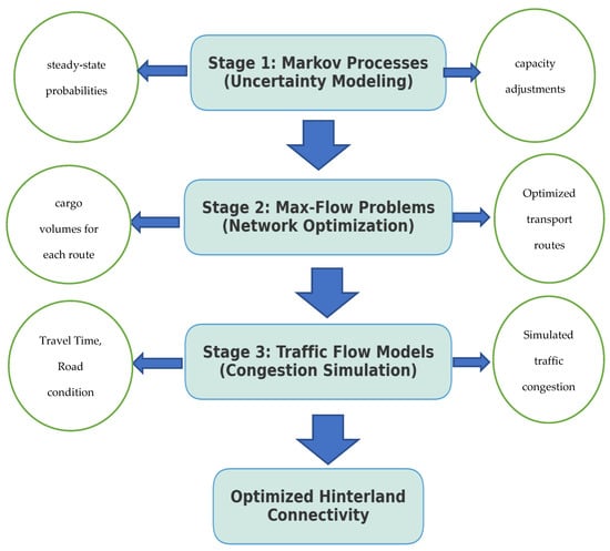 In response to these challenges, this paper proposes a novel optimization framework that integrates Markov processes, max-flow problems, and traffic flow models to enhance hinterland connectivity. Each of these models addresses specific aspects of the transportation problem. Markov processes are used to model the stochastic events and uncertainties inherent in cargo movement, such as random delays and equipment breakdowns [4,5]. Max-flow models optimize the throughput of goods from the port to inland destinations, ensuring the maximum use of available infrastructure while respecting capacity constraints [6,7]. Finally, traffic flow models simulate vehicle movement, allowing for an analysis of congestion and travel times on key routes.