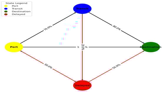 Markov processes are employed to model uncertainties in port operations, a crucial aspect of port logistics where fluctuations in cargo handling times, operational disruptions, and delays are common. The advantage of Markov processes lies in their ability to represent state transitions over time, allowing us to capture the dynamic nature of port operations. Using historical port data, including cargo arrival/departure times, delays due to equipment breakdowns, adverse weather, and congestion, we construct transition matrices. These matrices quantify the probabilities of moving between states, such as “Waiting at Port”, “In Transit” and “Delivered”, providing a realistic and adaptable model for the inherent uncertainties in port operations.