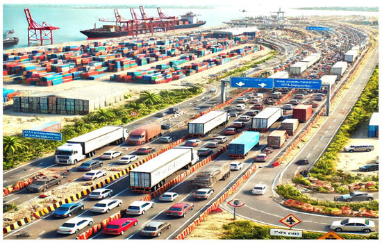 In this study, “cargo flow” refers to the movement of goods through the port and transport network, from arrival at the port to delivery at inland destinations [8,9]. “Traffic congestion” is the condition where the volume of vehicles exceeds the capacity of the roads, leading to delays and inefficiencies in the transportation network [10,11]. “Capacity optimization” involves adjusting the use of available infrastructure such as roadways, railways, and port facilities to maximize the throughput of goods while minimizing delays, congestion, and resource underutilization [12,13]. These terms are central to understanding the dynamics of port operations and hinterland connectivity.