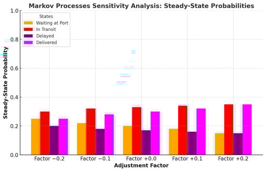 The Markov process model illustrates the flow of cargo through various stages: waiting at the port, in transit, delayed, and successfully delivered. Based on the transition probabilities, cargo spends approximately 15% of its time waiting at the port. This figure suggests that there could be inefficiencies in port handling or capacity constraints that need addressing. Improving port operations or expanding capacity could potentially reduce this waiting time, thereby increasing overall throughput.