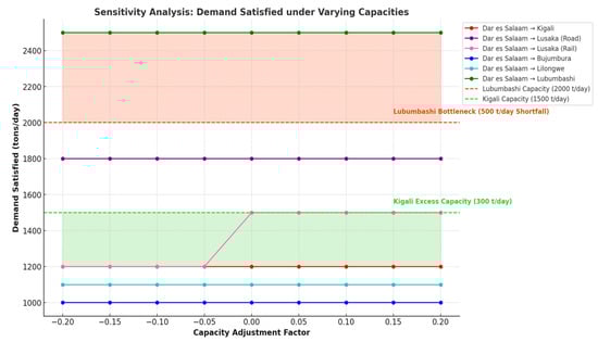 The analysis reveals that the road capacity from Dar es Salaam to Lusaka is sufficient to meet the demand of 1800 t/day by allocating 1500 t/day via rail and 300 t/day via road. However, the road capacity alone cannot fully meet the demand, indicating a need for balancing rail and road transport effectively.
